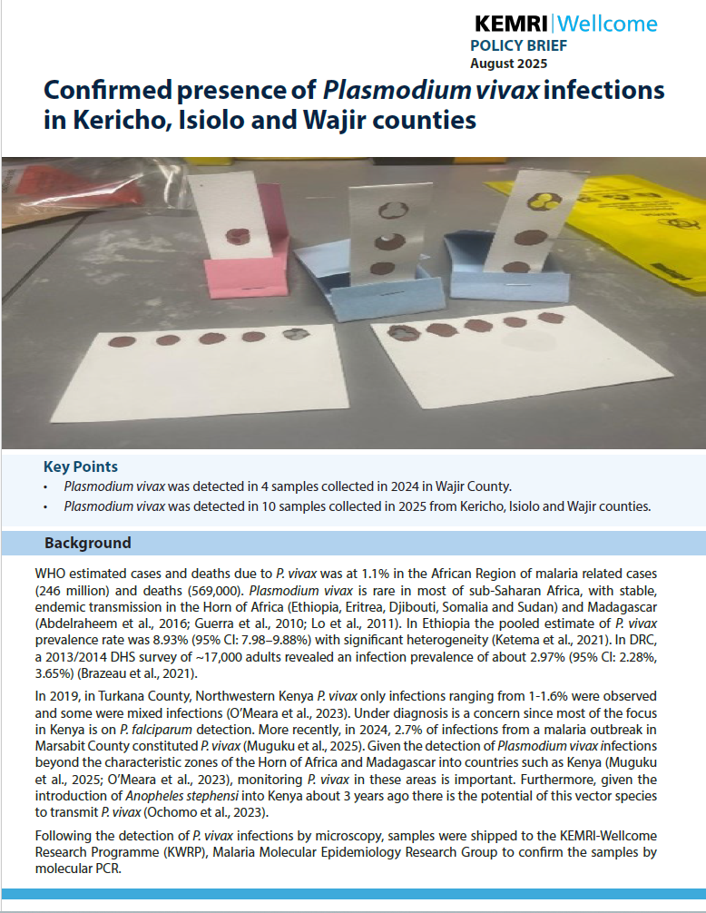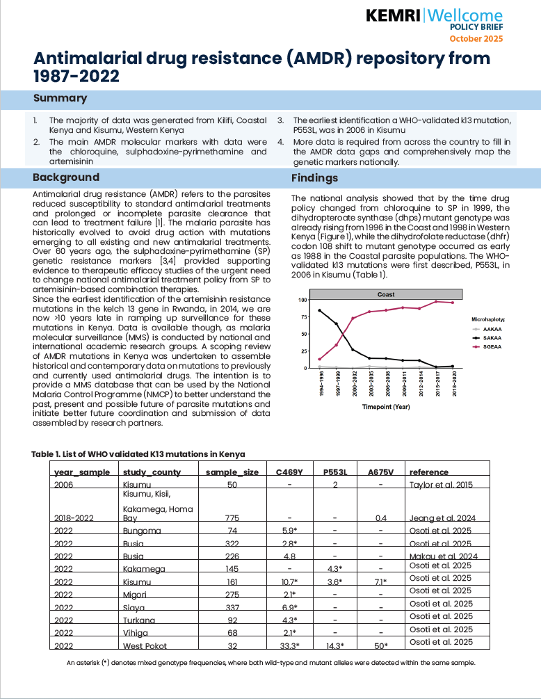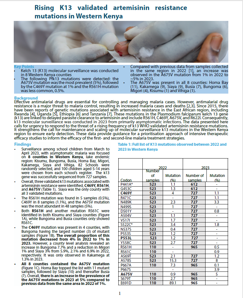 Home - More policy briefs Antimalarial drug resistance repository from 1987-2022 Confirmed presence of Plasmodium vivax infections in Kericho, Isiolo and Wajir counties Rising K13 validated artemisinin resistance policy brief