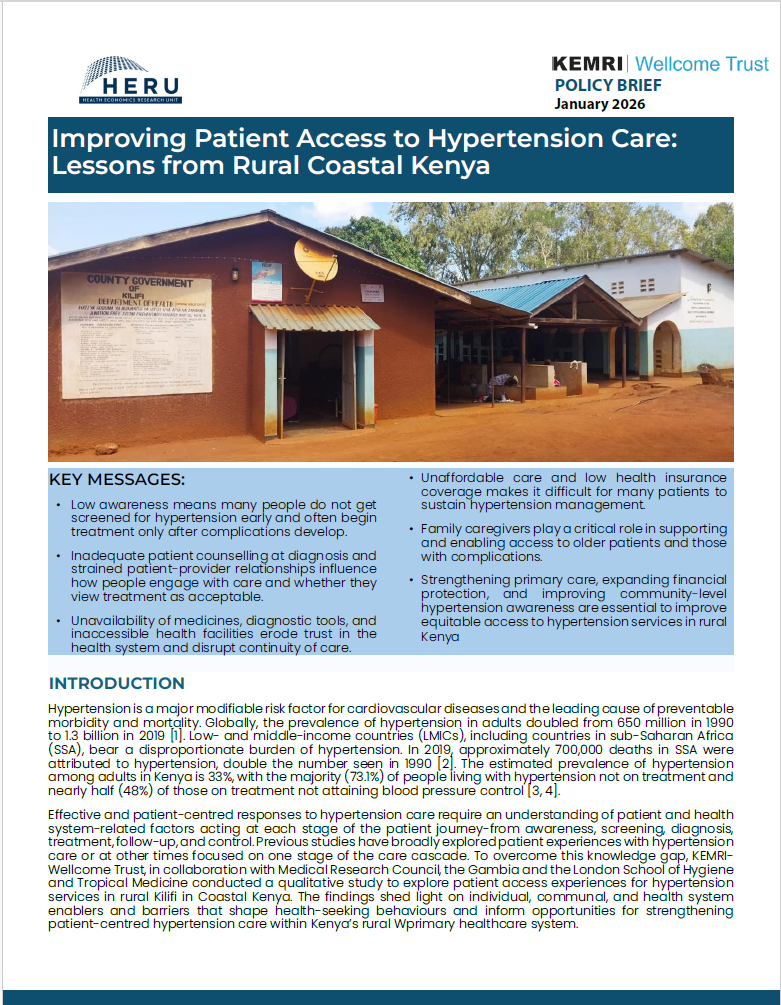 Home - More policy briefs Antimalarial drug resistance repository from 1987-2022 Confirmed presence of Plasmodium vivax infections in Kericho, Isiolo and Wajir counties Rising K13 validated artemisinin resistance policy brief Improving Patient Access to Hypertension Care - Lessons from rural coastal Kenya